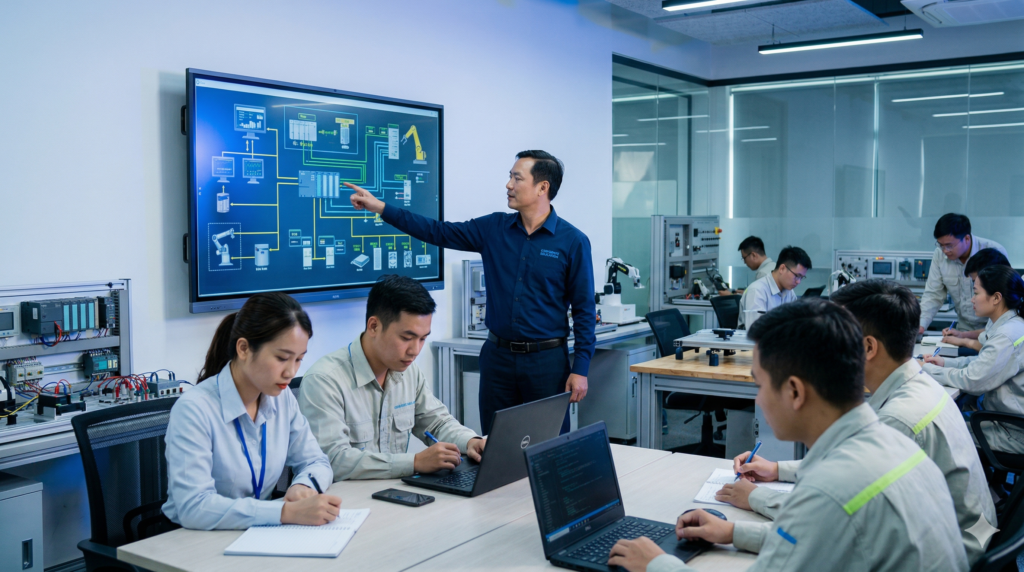 “Chương trình không chỉ củng cố nền tảng PLC/automation mà còn bổ sung đúng phần nhiều kỹ sư thiếu khi đi dự án: cách kiểm thử và chuẩn hóa trước khi triển khai. Emulate3D Virtual Commissioning là một bước nâng chuẩn rất mạnh, giúp giảm vòng lặp sửa lỗi, tăng tốc tiến độ, và quan trọng nhất là kiểm soát rủi ro khi chạy máy thật.”
