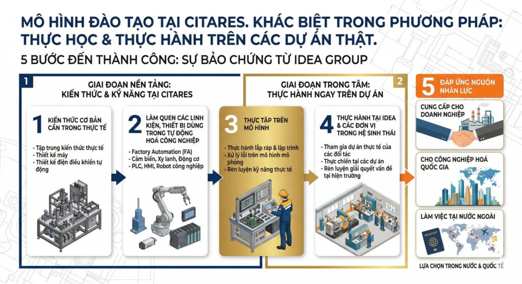 Với vai trò đơn vị đầu tư và bảo trợ, IDEA Group mang đến cho CITARES tầm nhìn dài hạn, năng lực triển khai dự án, tiêu chuẩn vận hành công nghiệp và hệ sinh thái cơ hội việc làm. Đây là lý do CITARES không đi theo mô hình “trung tâm đào tạo độc lập”, mà được xây dựng như một mảnh ghép chiến lược trong chuỗi giá trị công nghiệp.